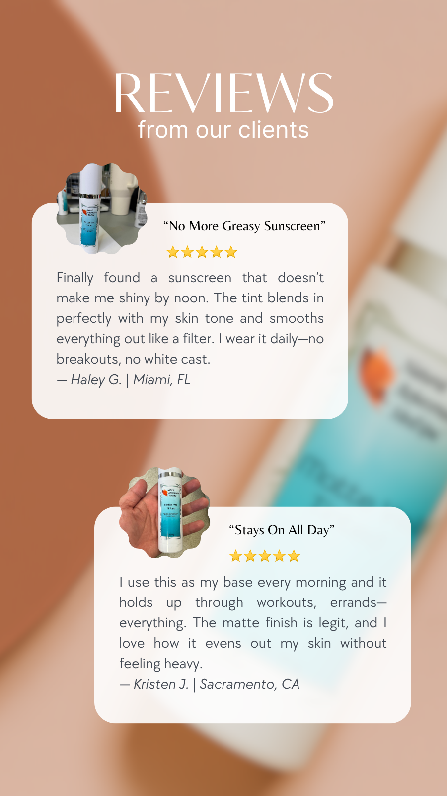 Experience advanced sun protection with this lightweight, water-resistant sunscreen that’s perfect for all skin types. Formulated with Zinc Oxide and Titanium Dioxide, this broad-spectrum SPF shields your skin from harmful UVA and UVB rays while defending against blue light exposure, a common contributor to premature aging. Its skin-perfecting tint seamlessly blends to even tone and minimize imperfections. With a matte finish, it keeps excess shine at bay for a soft, velvety feel all day. Infused with soothing Bisabolol, it calms and comforts skin, making it ideal for even the most sensitive types. Stay protected and confident while offering up to 40 minutes of water resistance for long-lasting wear. Perfect for all skin types, this multitasking essential is your ultimate shield for healthy, beautiful skin.